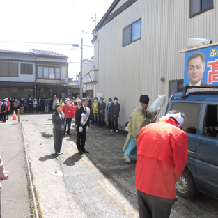 昨日、午前10時より地元仲町6丁目の選対本部事務所横の駐車場にて、「出陣式」が執り行われました。